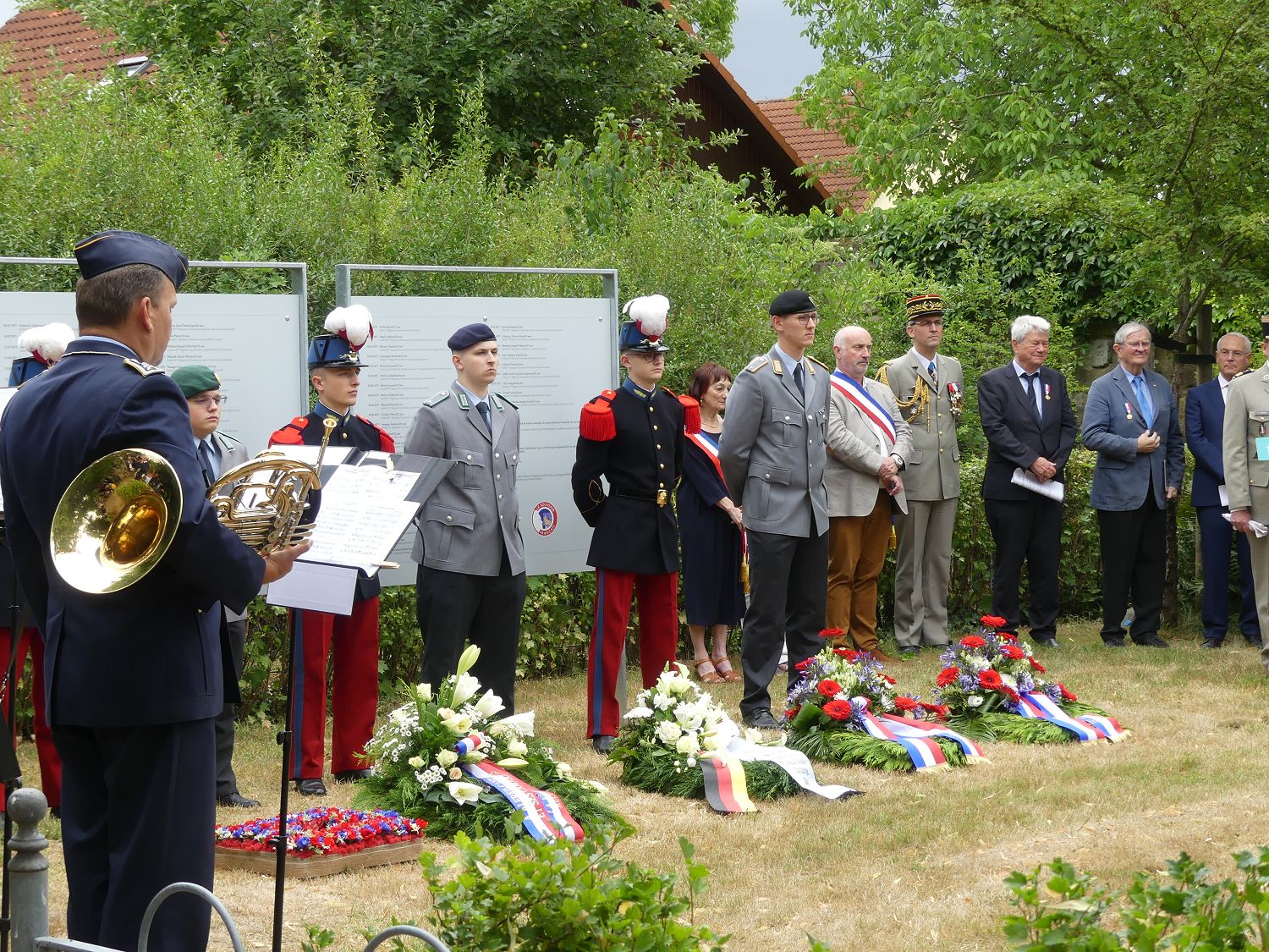 Vor ca. 120 Gästen entfaltete sich ein kleines militärisches Zeremoniell mit Redebeiträgen, Glockengeläut, einer Kranzniederlegung und dem Abspielen der deutschen und französischen Hymnen und Totensignale (Sonnerie aux Morts / Der Gute Kamerad).