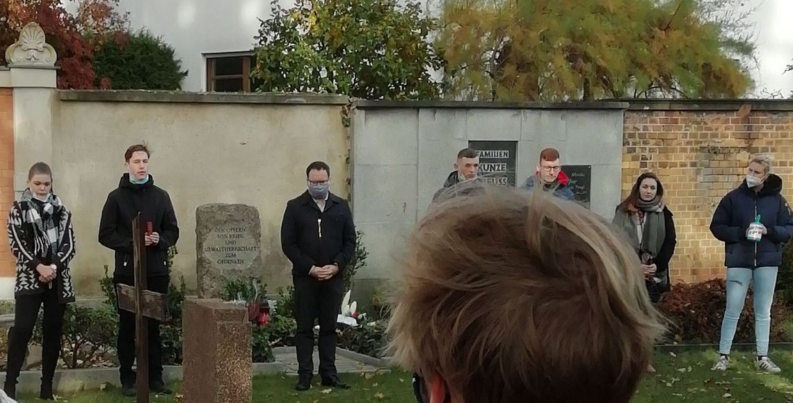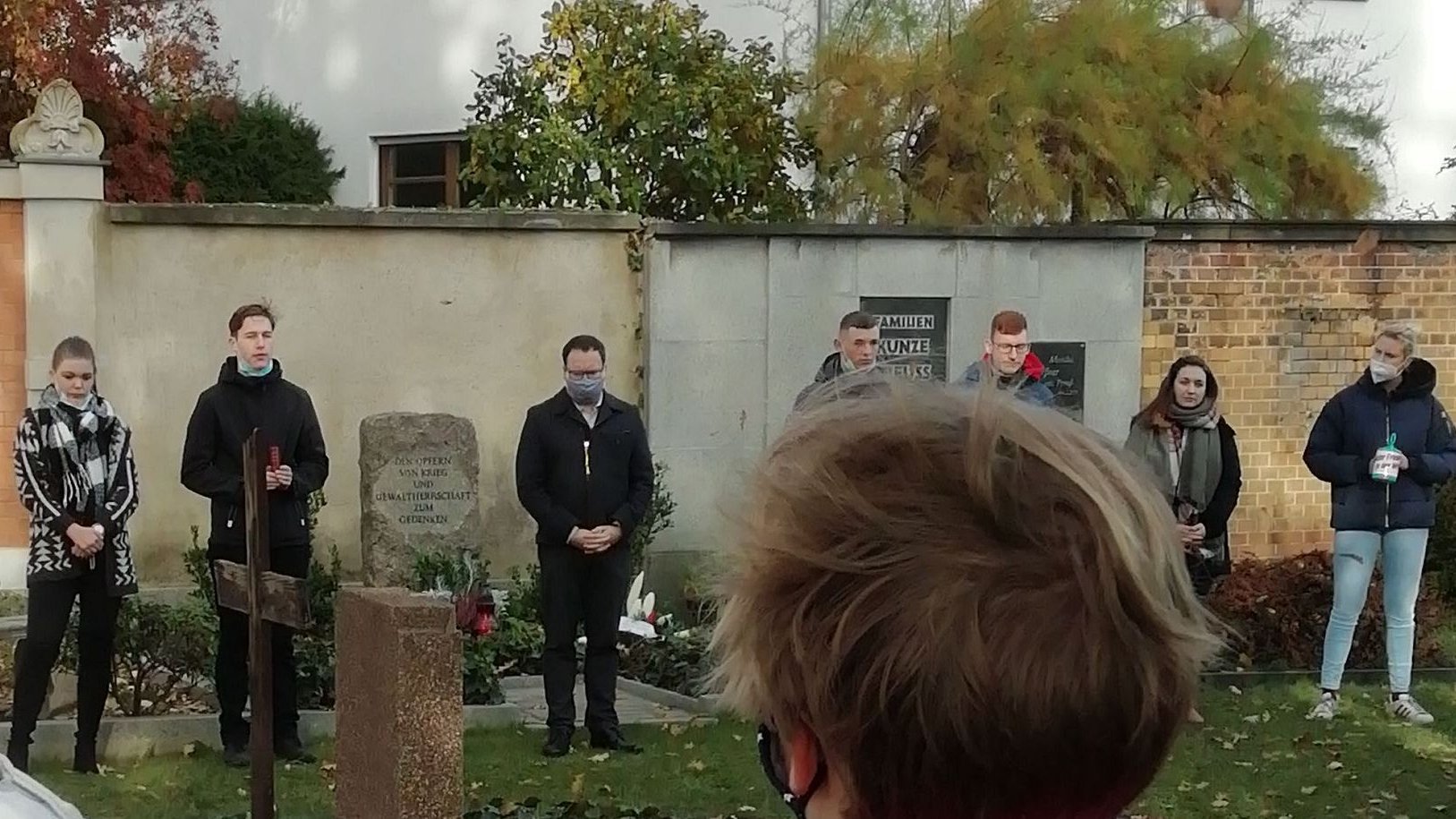 Am Sonntag, dem Volkstrauertag, nahmen Schülerinnen und Schüler der Jahrgangsstufen 10 bis 12 gemeinsam mit unserer Schulleiterin Frau Rentsch und ihren Geschichtslehrern an der jährlich stattfindenden Gedenkveranstaltung der Stadt Taucha teil. Sie hatten bereits einige Tage zuvor den Tauchaer Friedhof mit seinen Kriegsgräbern aufgesucht und die dort vor zwei Jahren von Absolventen des Gymnasiums erarbeitete und aufgestellte Informationstafel studiert, um die Geschichte von Krieg und Gewaltherrschaft vor Ort besser nachvollziehen zu können. So vorbereitet und emotional betroffen sprachen die Schülerinnen und Schüler das traditionelle Totengedenken. Gleichzeitig drückten sie unsere Hoffnung auf Versöhnung unter den Menschen aus und hoben unsere gemeinsame Verantwortung für den Frieden in Deutschland und in der ganzen Welt hervor.