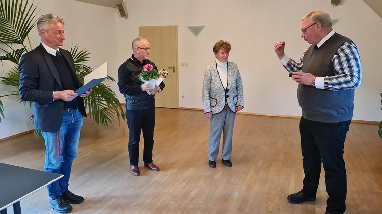 Außerdem wurde Superintendent i. R. Friedhart Vogel für sein Volksbundengagement ausgezeichnet. Als aktiver Verfechter der Ideale des Volksbundes ist das Gründungsmitglied des Regionalverbandes seit 1994 ununterbrochen an der Organisation und Durchführung der Höhepunkte des Regionalverbandes und insbesondere der Gedenkfeiern zum Volkstrauertag auf der Kriegsgräberstätte Nardt-Weinberg sowie auf der Gedenkstätte Ehrenhain in Hoyerswerda federführend beteiligt. Er bereichert zudem durch seinen offenen und vertrauensvollen Umgang das Vereinsleben in vielfältigster Art und Weise. Hierfür wurde ihm nun während der Frühjahrstagung das Ehrenkreuz des Volksbundes in Gold verliehen.