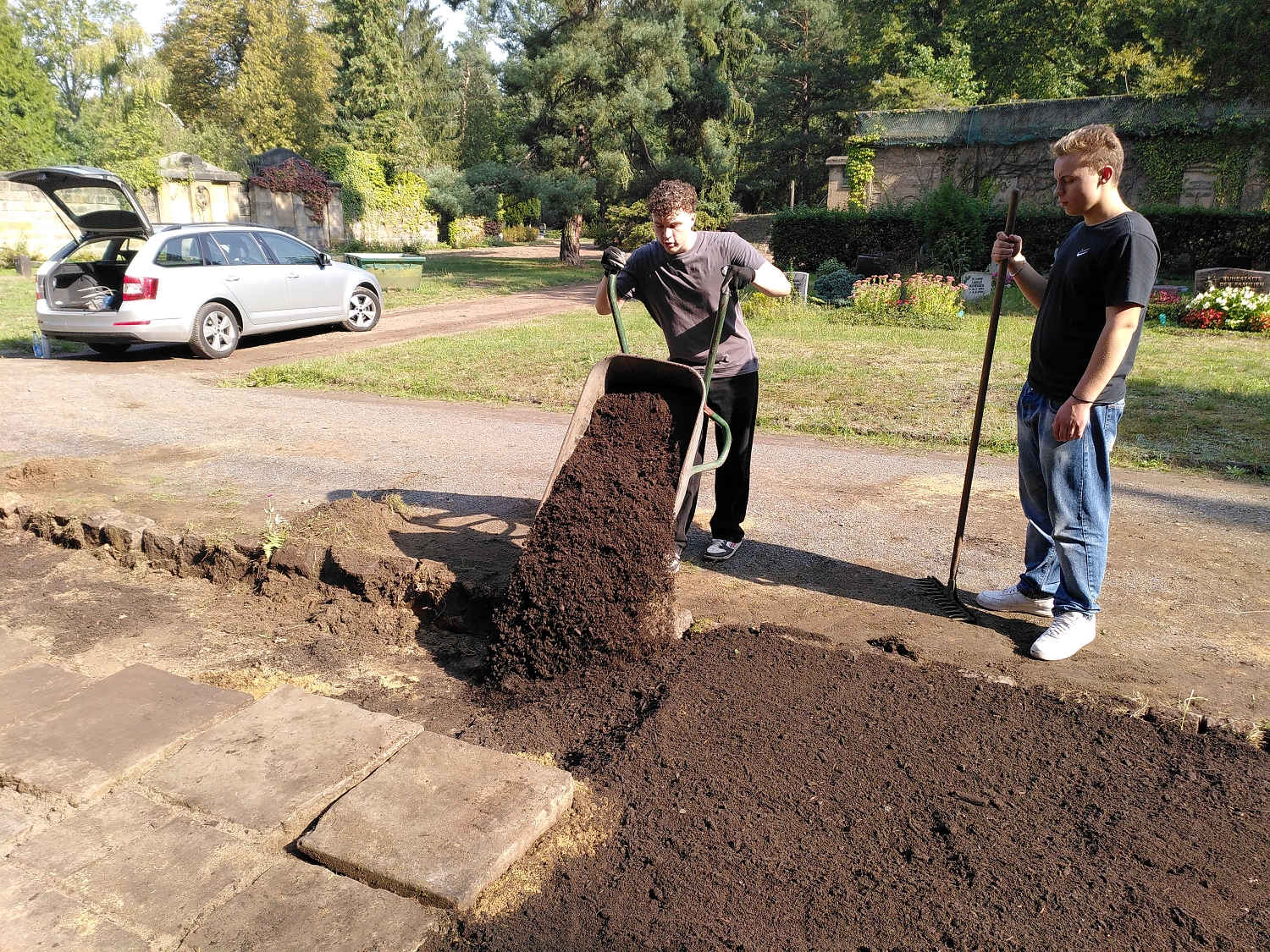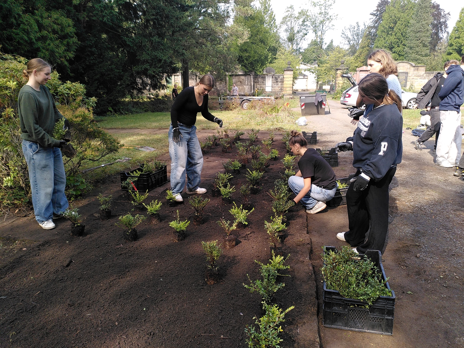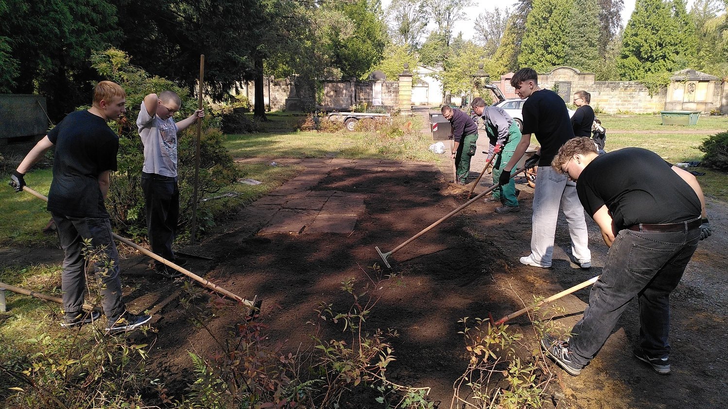 Die Klassen 9a und 9b machten sich mit viel Tatkraft ans Werk, die Grab- und Gedenkstätte für die Opfer des Bombenangriffs auf Dresden am 13. und 14. Februar 1945 zu pflegen und neu zu bepflanzen. Diese praktische Arbeit stellte den zweiten Projekttag dar, der den jungen Leuten die Möglichkeit bot, aktiv zur Erhaltung der Erinnerungskultur beizutragen.