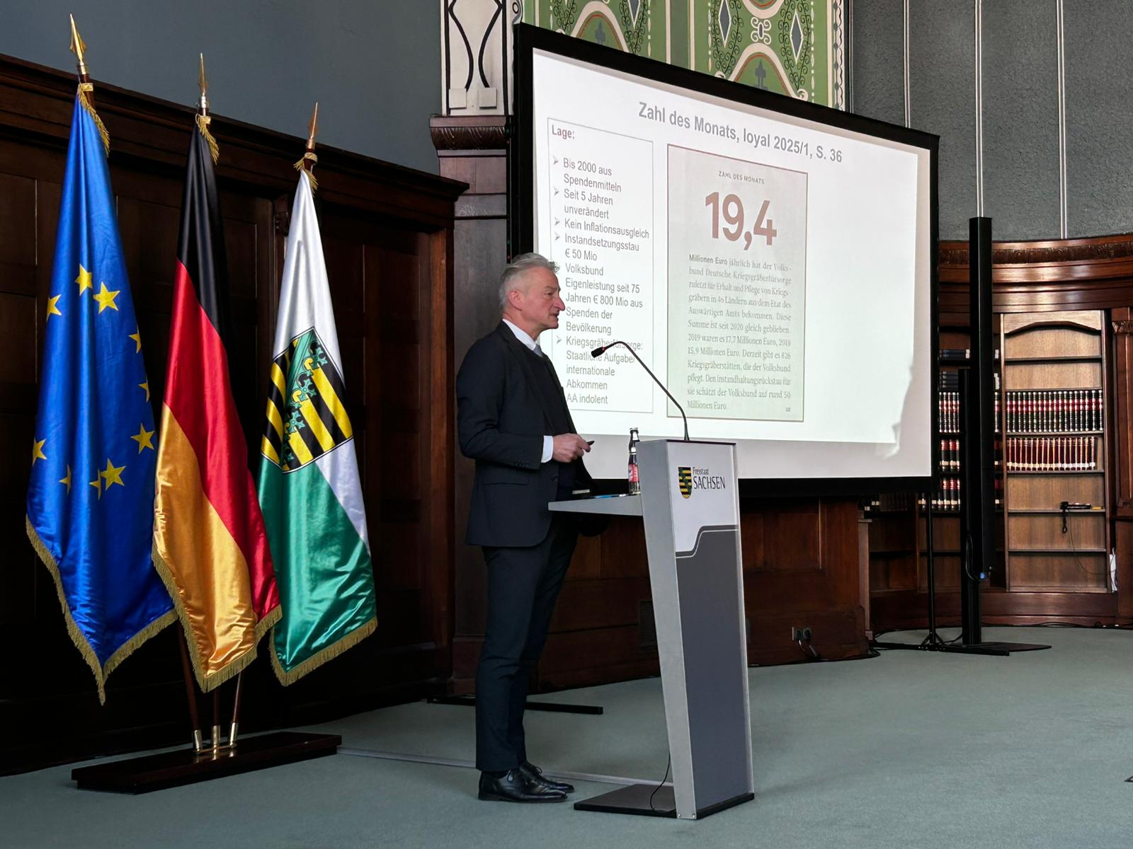 „Der Volksbund Deutsche Kriegsgräberfürsorge e. V. finanziert sich zu einem großen Teil aus Spenden. Deshalb freue ich mich besonders über das große Engagement, für das ich allen Beteiligten herzlich danke. Was uns sehr ernsthaft Sorgen bereitet, ist, dass sich die Bundesrepublik Deutschland als unser Auftraggeber systematisch aus der Verantwortung und Pflicht stiehlt. Das zeigt sich am beklagenswerten Instandsetzungsstau, den man als Besucher auf unseren Friedhöfen im Ausland mittlerweile erkennen kann und der bei rund 50 Millionen Euro liegt. Die Deutschen Soldatenfriedhöfe sind im Ausland eine Visitenkarte der Bundesrepublik und ihr Zustand fällt deutlich hinter englische oder französische Anlagen zurück. Wir tun dabei unser Möglichstes, doch letztlich ist Kriegsgräberfürsorge staatlicher Auftrag, dem sich die Bundesrepublik nicht entziehen darf.“