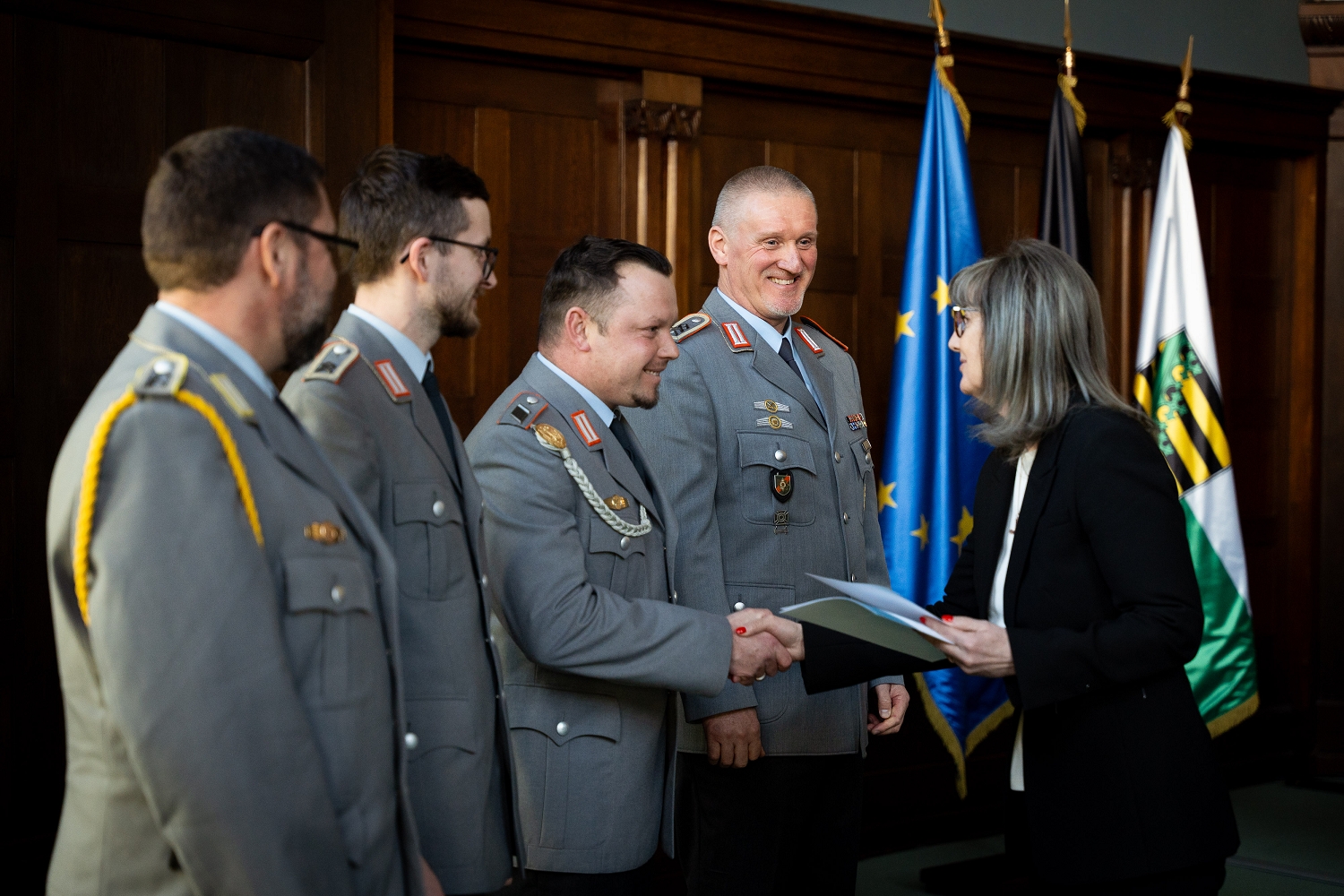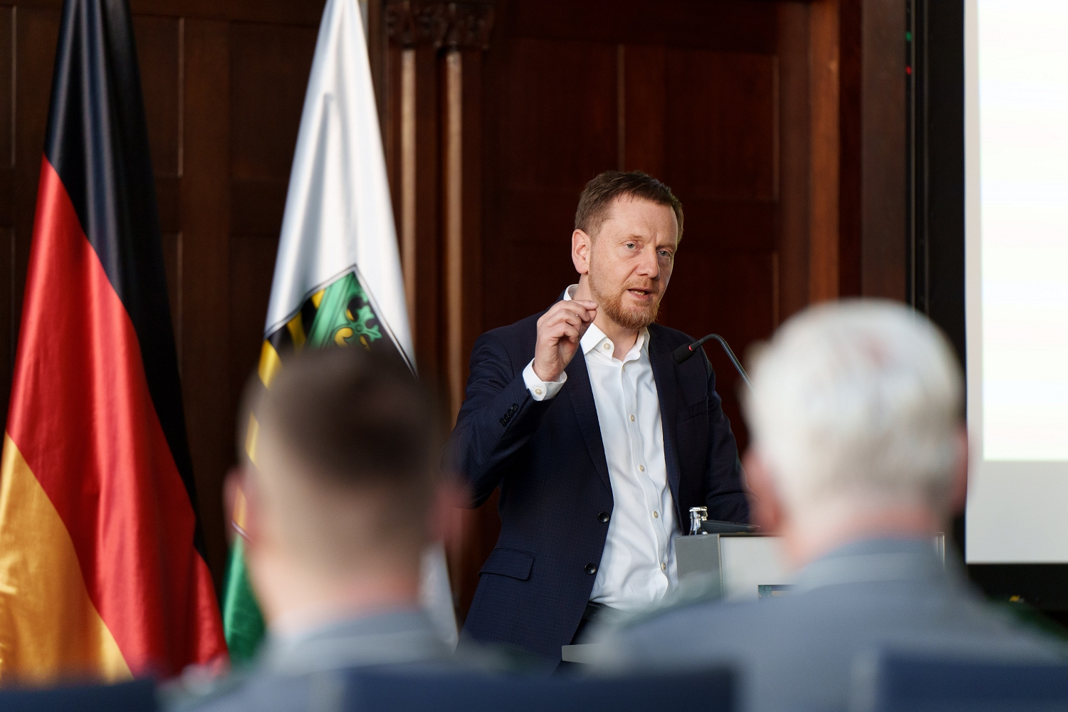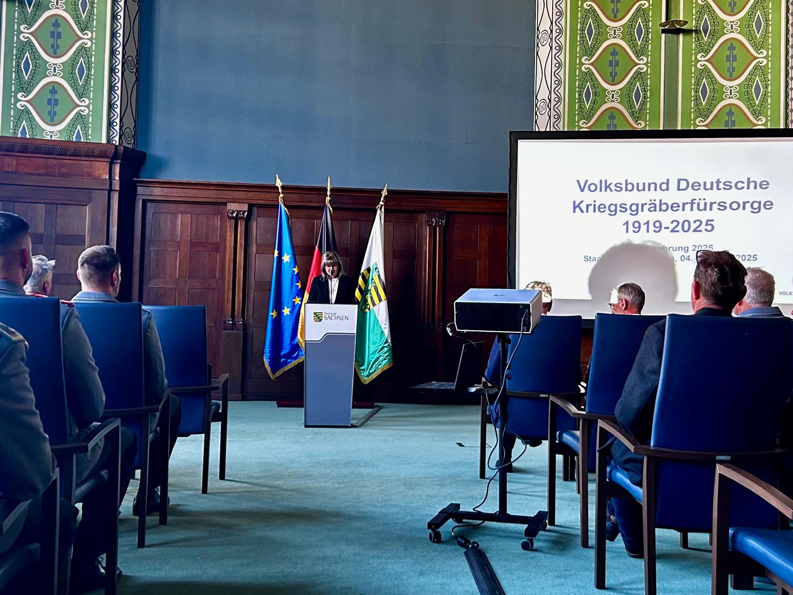 Am heutigen Dienstag in der Zeit von 12:00 bis 13:00 Uhr empfing der Sächsische Ministerpräsident, Michael Kretschmer, zusammen mit der Landesvorsitzenden des Volksbunds Deutsche Kriegsgräberfürsorge, Andrea Dombois, 50 aktive Soldaten der Bundeswehr, Reservisten und engagierte Bürgerinnen und Bürger in der Staatskanzlei zur Sammlerehrung. Dabei würdigten die Landesvorsitzende und der Ministerpräsident die Leistung und den Einsatz von Soldaten und Bürgern für die Belange des Volksbunds Deutsche Kriegsgräberfürsorge. Sei es bei Pflegeeinsätzen und vor allem bei der Haus- und Straßensammlung 2024, die in Sachsen in diesem Jahr wieder eine fünfstellige Summe zugunsten der Kriegsgräberfürsorge ertrug. Aus diesem Anlass erhielten die Sammler eine Urkunde und einen „Coin“.
