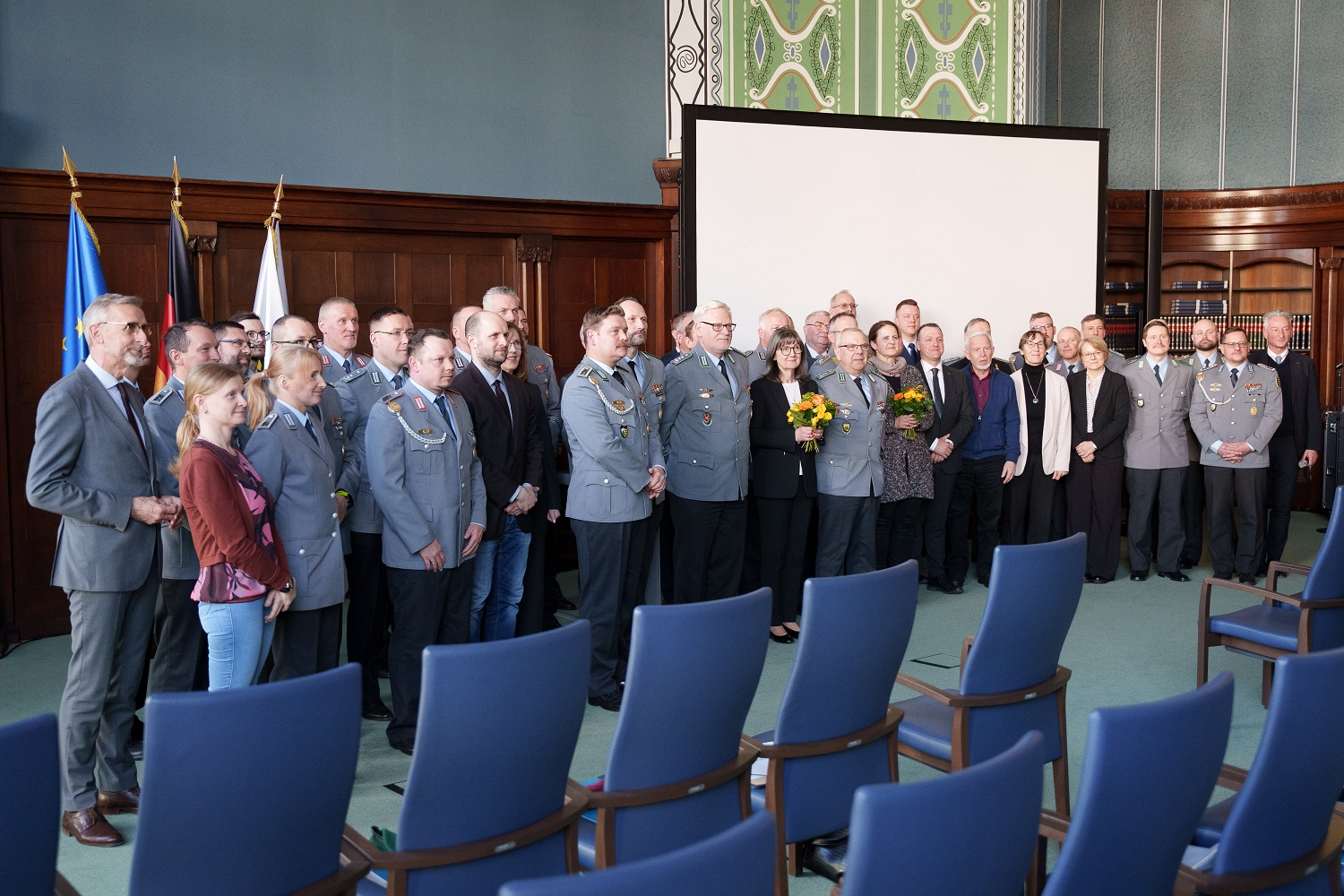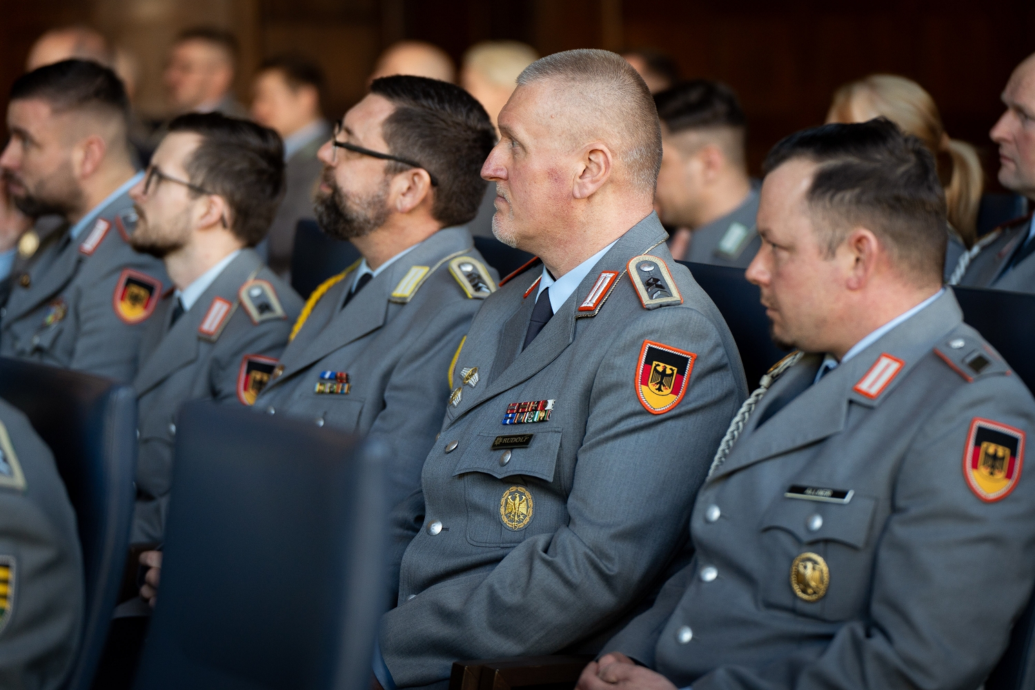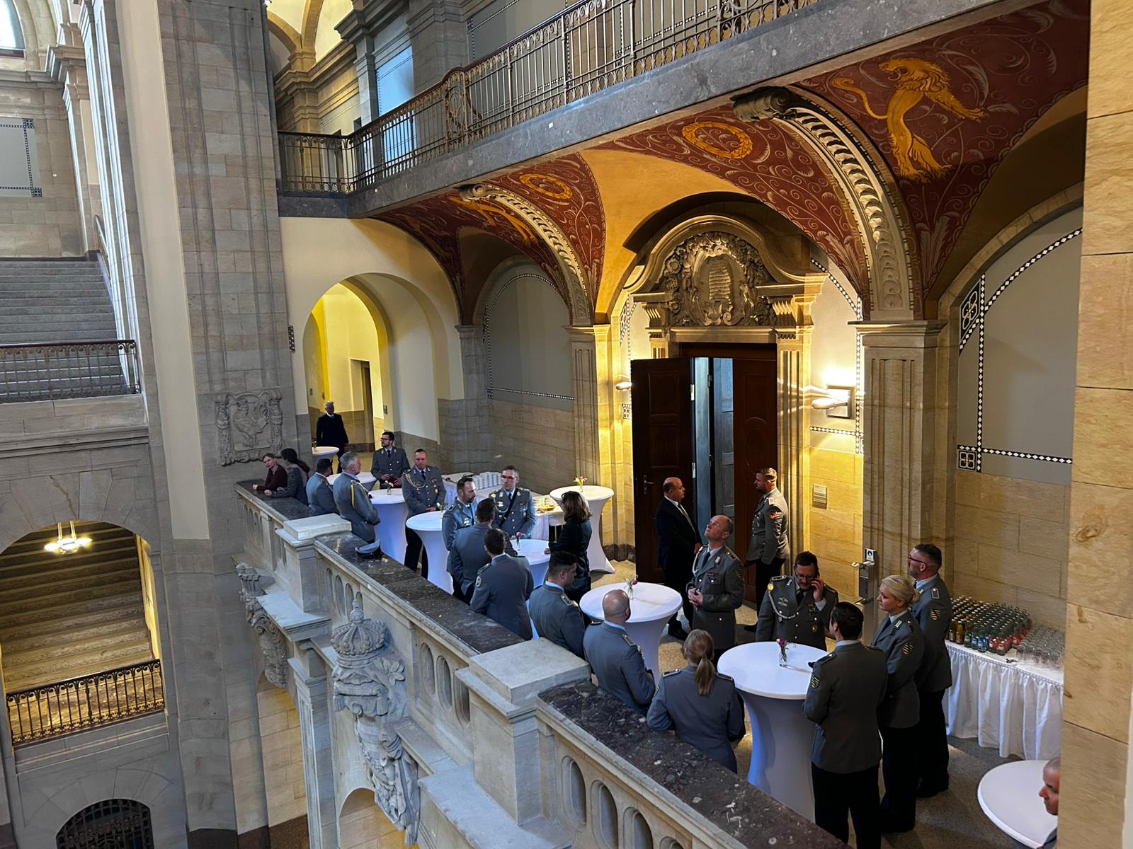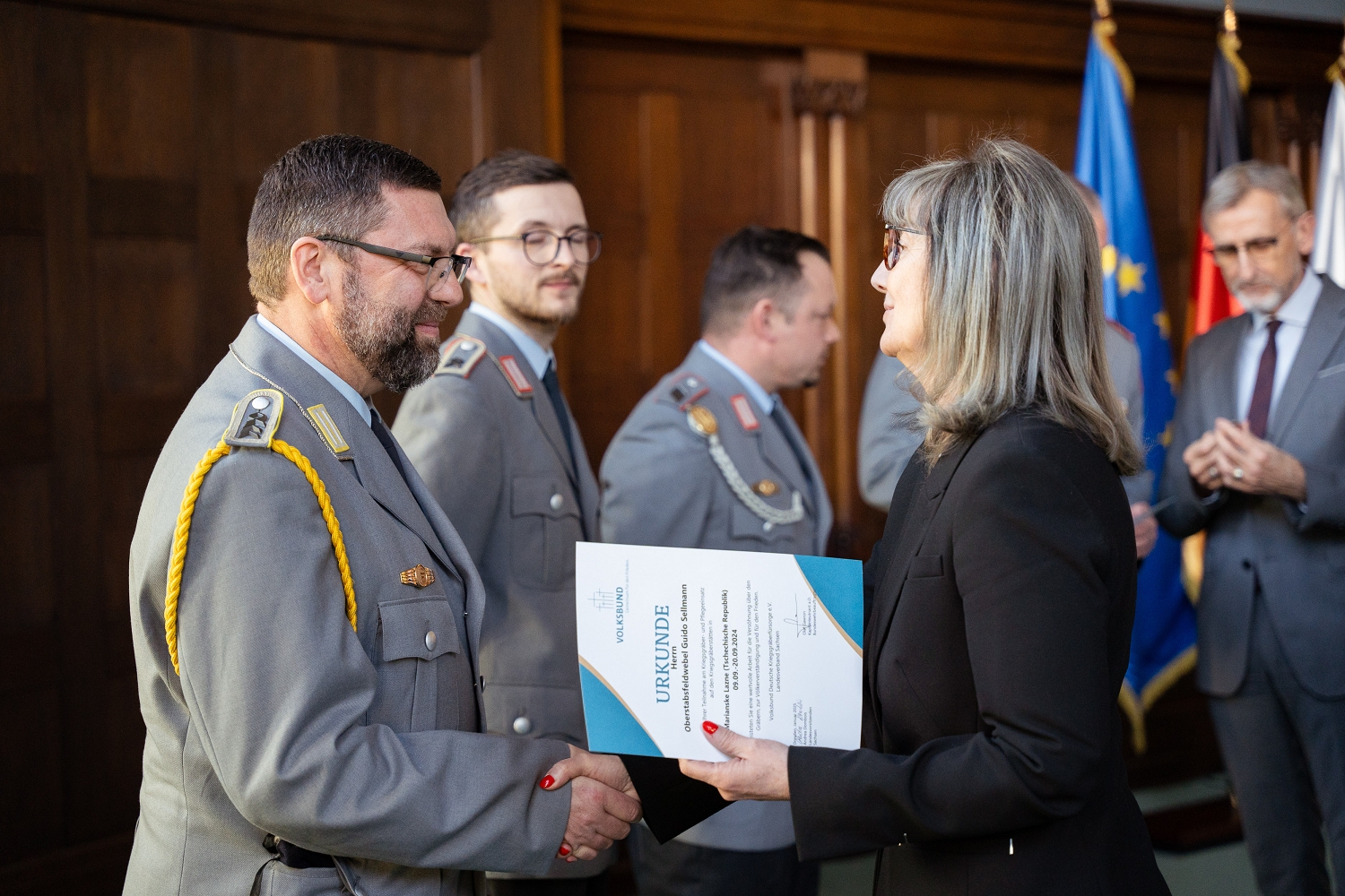 Am heutigen Dienstag in der Zeit von 12:00 bis 13:00 Uhr empfing der Sächsische Ministerpräsident, Michael Kretschmer, zusammen mit der Landesvorsitzenden des Volksbunds Deutsche Kriegsgräberfürsorge, Andrea Dombois, 50 aktive Soldaten der Bundeswehr, Reservisten und engagierte Bürgerinnen und Bürger in der Staatskanzlei zur Sammlerehrung. Dabei würdigten die Landesvorsitzende und der Ministerpräsident die Leistung und den Einsatz von Soldaten und Bürgern für die Belange des Volksbunds Deutsche Kriegsgräberfürsorge. Sei es bei Pflegeeinsätzen und vor allem bei der Haus- und Straßensammlung 2024, die in Sachsen in diesem Jahr wieder eine fünfstellige Summe zugunsten der Kriegsgräberfürsorge ertrug. Aus diesem Anlass erhielten die Sammler eine Urkunde und einen „Coin“.