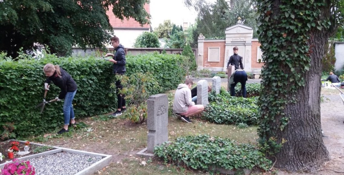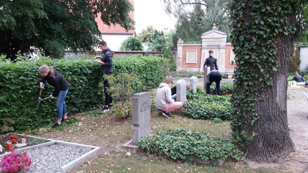 Den Abschluss der Projektwoche bildete ein Arbeitseinsatz auf dem Tauchaer Friedhof. Die Jugendlichen des Leistungskurses Geschichte unter Leitung von Frau Hübner wollten mit ihrem Engagement dazu beitragen, dass die vorhandenen Einzelgräber in einem würdevollen Zustand erscheinen. So erneuerten sie beispielsweise den Anstrich der teilweise bereits stark verwitterten Holzkreuze, die drei der Gräber kennzeichnen. Auch gärtnerische Arbeiten standen auf der To-do-Liste. Nur wenn es gelingt, die Kriegsgräber in unserem Umfeld dauerhaft zu erhalten und mit zusätzlichen Informationen zu versehen, können sie ihrer Funktion gerecht werden, zukünftige Generationen zu mahnen, zu welchen schrecklichen Folgen Intoleranz, Hass und schließlich daraus resultierende Krieg- und Gewaltherrschaften führen.