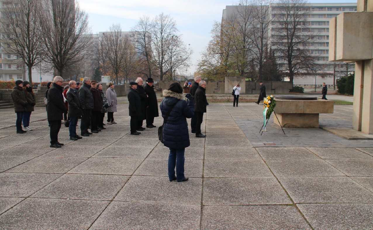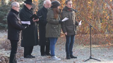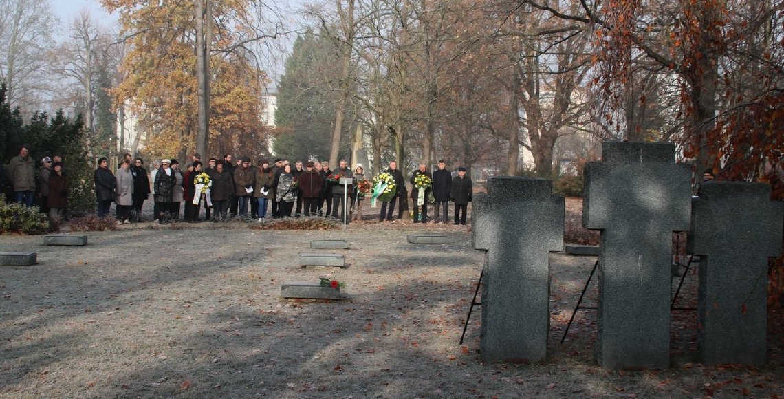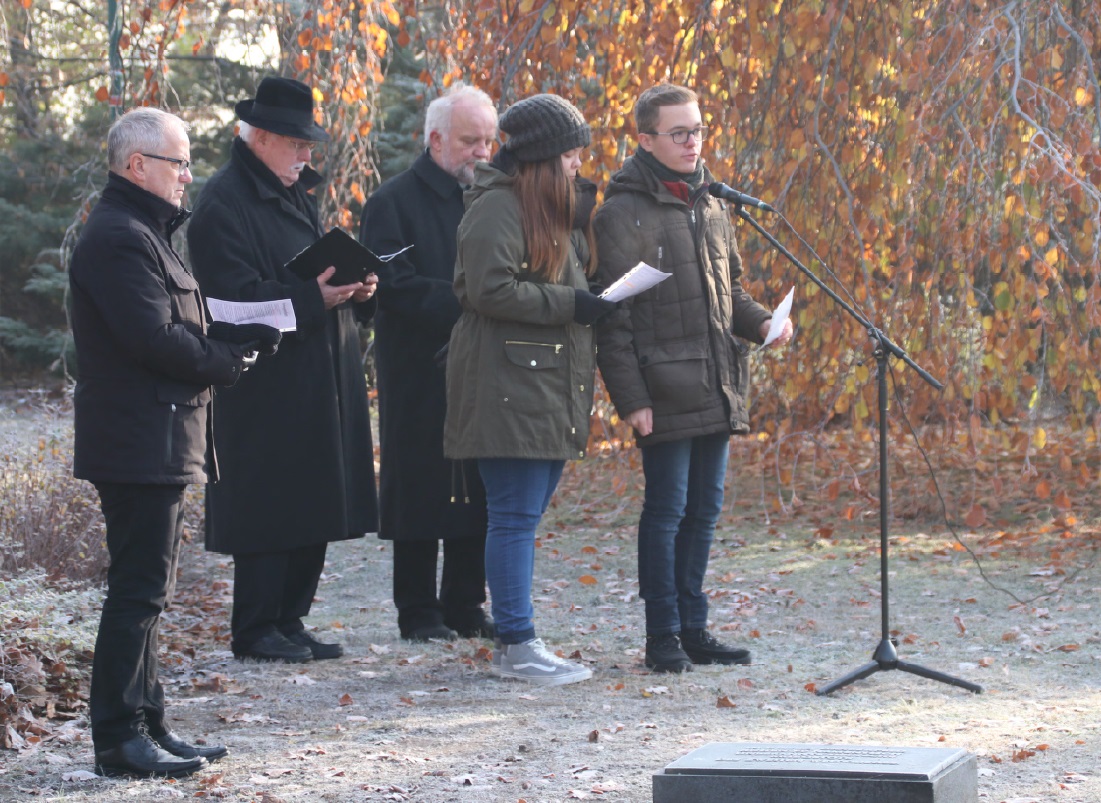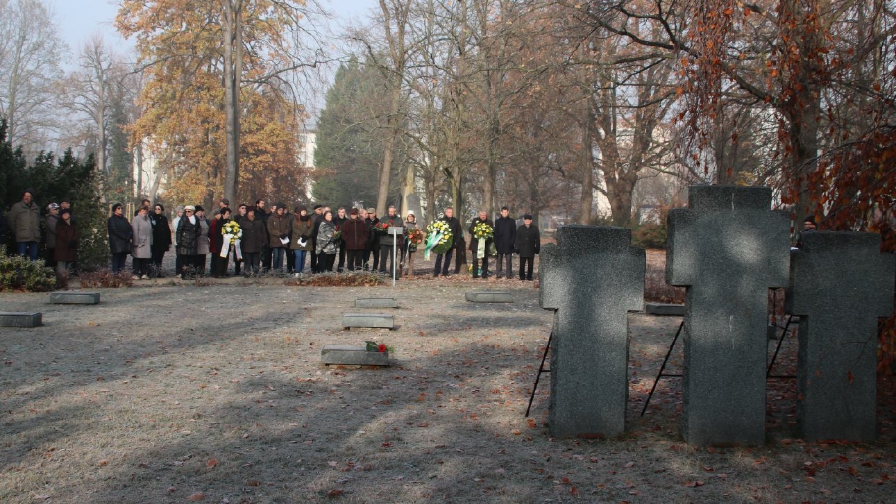Auf der Kriegsgräberstätte Ehrenhain in Hoyerswerda wurde die Gedenkstunde gemeinsam durch Oberbürgermeister Stefan Skora, der auch das Totengedenken vortrug, von Superintendent i.R. Friedhardt Vogel von der evangelischen und Pfarrer Peter Paul Gregor von der katholischen Kirchgemeinde sowie von zwei Schülern des Christlichen Johanneums Hoyerswerda gestaltet (zweites Foto: v.l.n.r.).