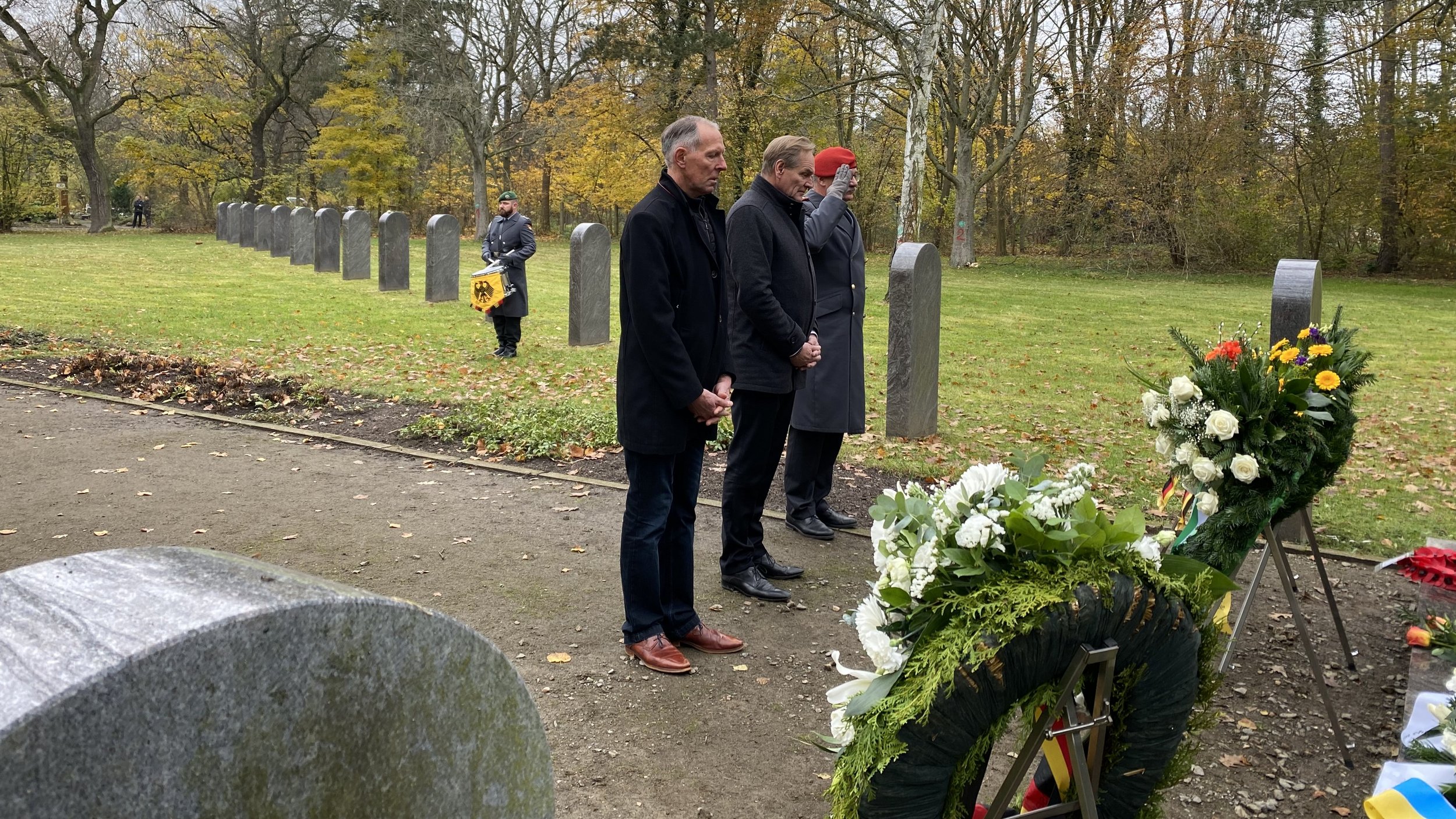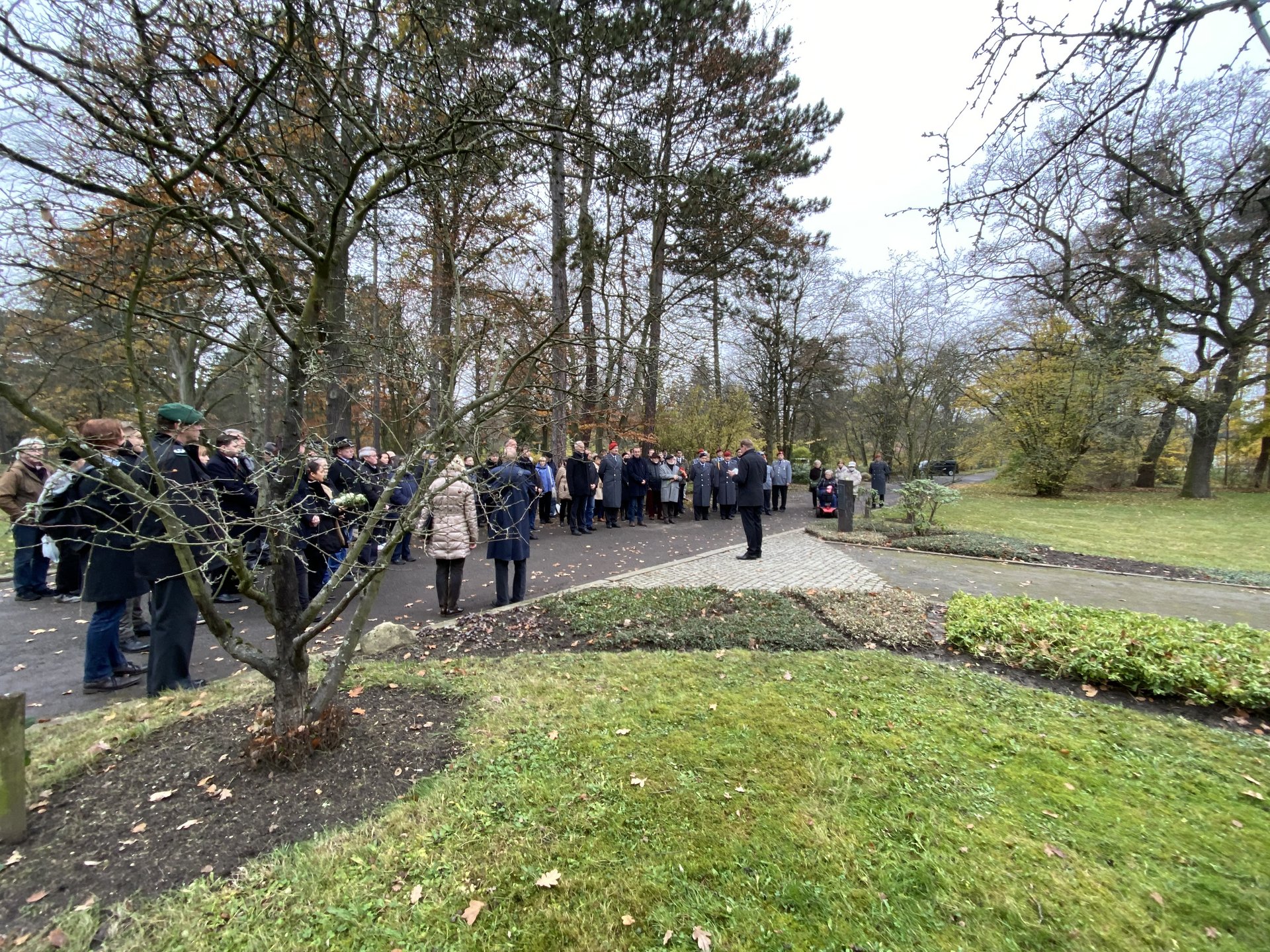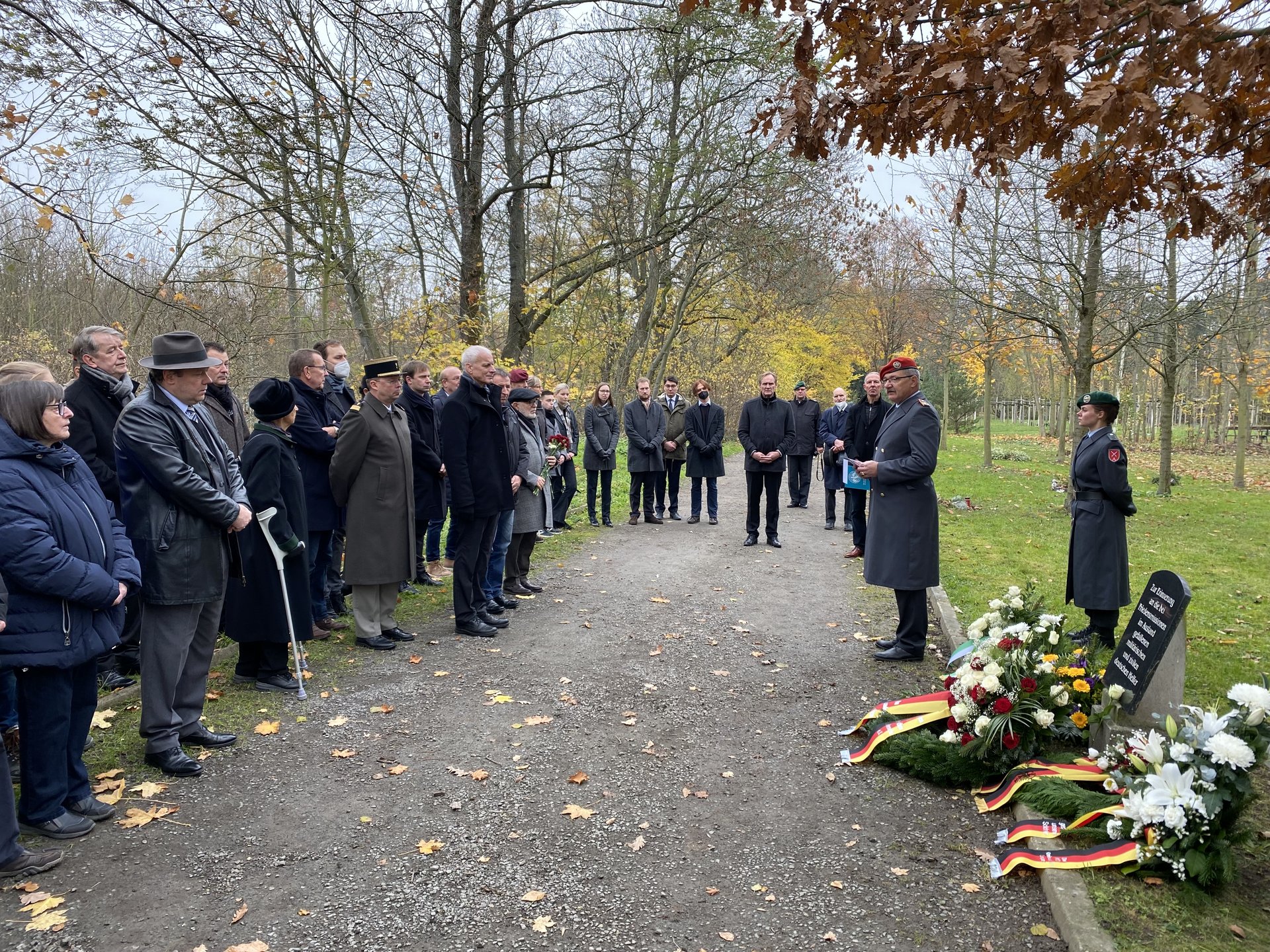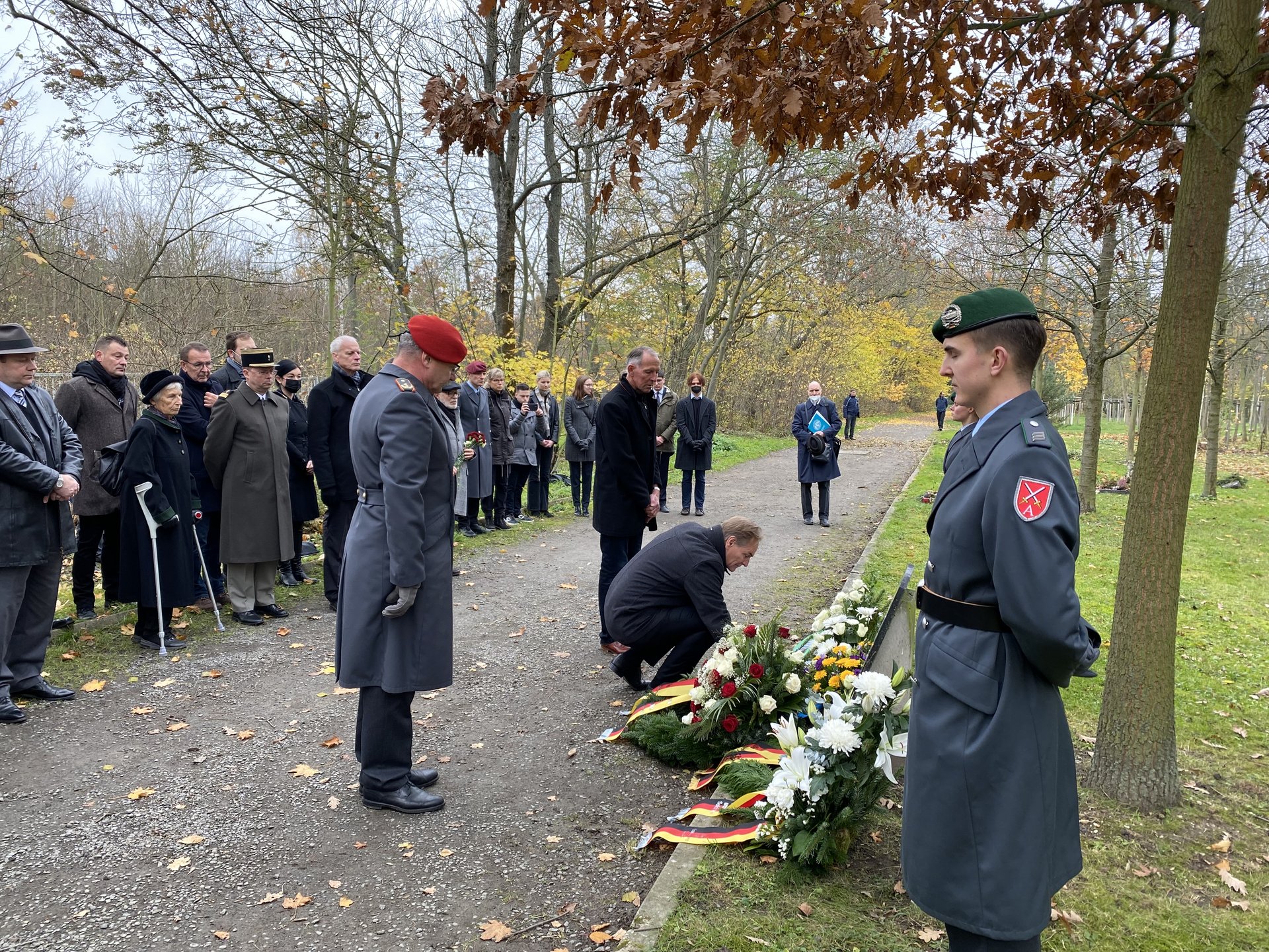 Nach den coronabedingten Einschränkungen im Vorjahr war die Gedenkveranstaltung zum Volkstrauertag 2021 in Leipzig wieder sehr gut besucht und es gab gute Gespräche mit den Vertretern von Stadt, Bundeswehr, Reservistenverband und diplomatischen Vertretungen sowie Verbindungsoffizieren. Der Vorsitzende des Volksbund-Stadtverbands Jens Lehmann, MdB, legte zusammen mit Oberbürgermeister Burkhard Jung und General Michael Hochwart, dem neuen Kommandeur des Ausbildungskommandos Leipzig, Kränze auf der Grab- und Gedenkanlage der Leipziger zivilen Bombenopfer des Zweiten Weltkrieges sowie am Gedenkstein für die im Ausland bei Friedenseinsätzen gefallenen militärischen und zivilen Helfer im "Hain der Erinnerung" nieder. Zudem wurden Grußworte verlesen.