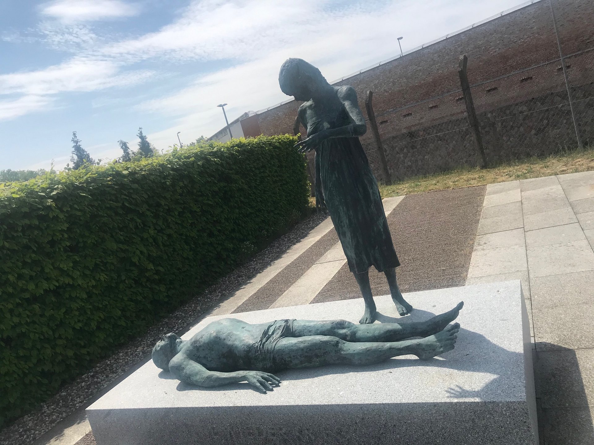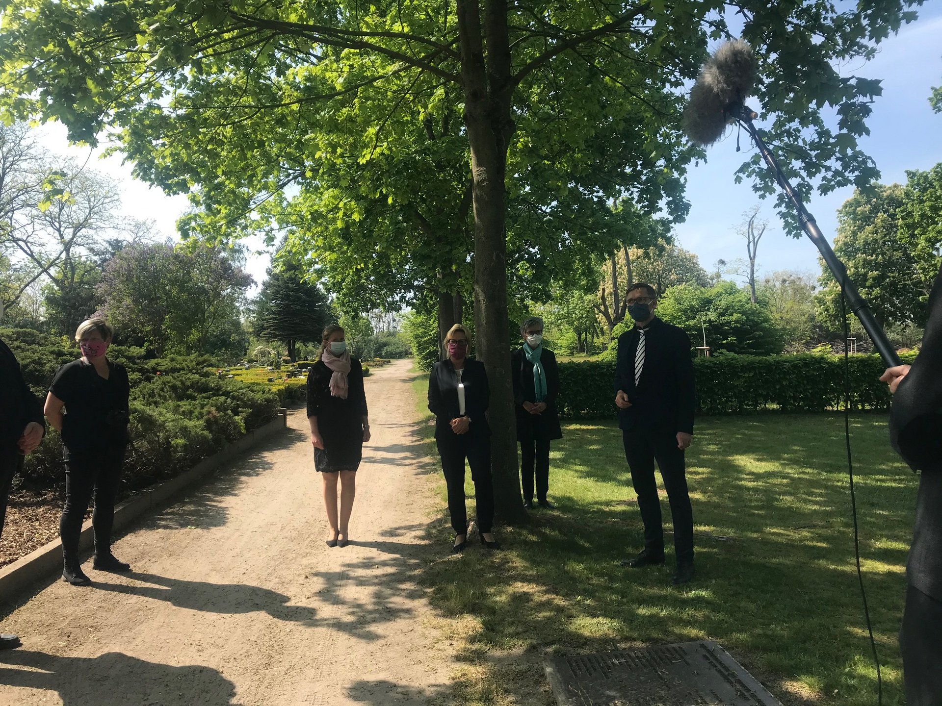 Ein Teil des Kurses begab sich zusammen mit der Schulleiterin zum Denkmal am Kleinen Schöppenteich im Stadtzentrum, die anderen gedachten der Opfer des Zweiten Weltkriegs und des Nationalsozialismus an den Kriegsgräbern auf dem Tauchaer Friedhof. Natürlich immer mit dem nötigen Abstand.