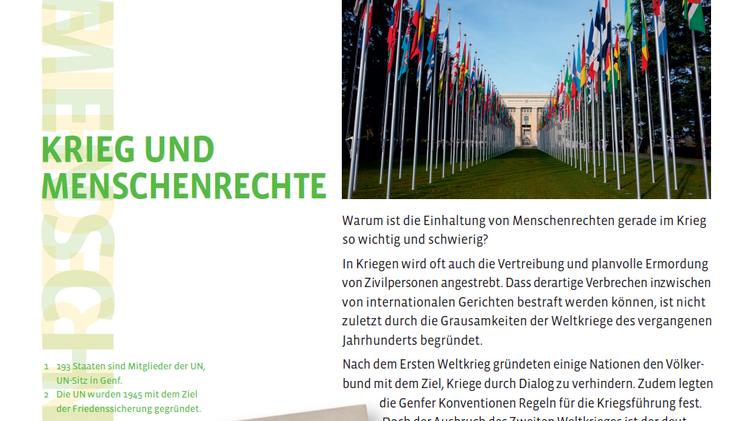 Parallel zur Ausstellung ist unter dem Titel „Krieg und Menschenrechte“ eine umfangreiche pädagogische Handreichung in der Reihe „BEISPIELE PRAXIS“ erschienen. Diese enthält neben historischen Hintergründen und aktuellen Bezügen zum Thema vor allem didaktische Hinweise und konkrete Material- und Arbeitsvorschläge für den Unterricht. Das vielfältige Material, in das aktuelle Forschungsergebnisse eingeflossen sind, eignet sich gleichermaßen für die schulische und außerschulische historisch-politische Bildung junger Menschen.