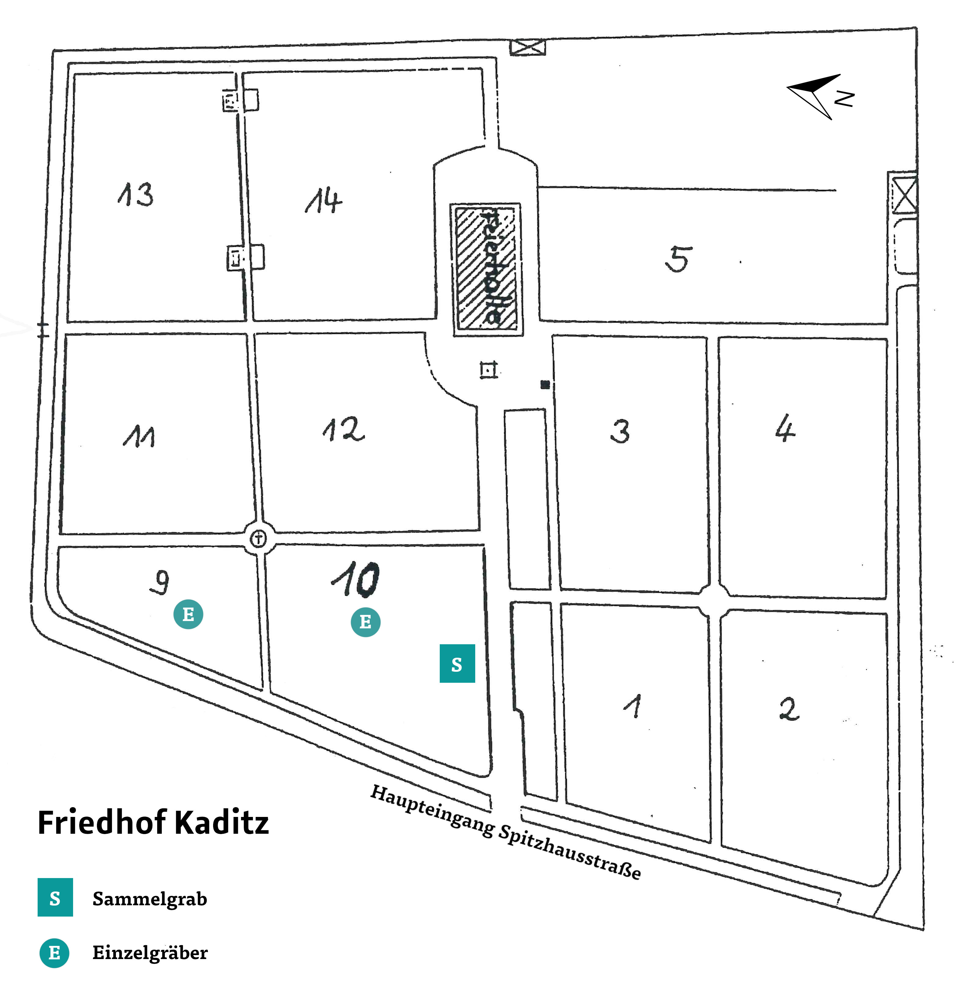 Der Friedhof an der Spitzhausstraße in Kaditz ist das dritte Friedhofsareal der Gemeinde, das aufgrund der steigenden Bevölkerungszahlen benötigt wurde. 1878 wurde der Friedhof eingeweiht. Auf dem Friedhof sind vor allem zivile Opfer der Luftangriffe auf Dresden während des Zweiten Weltkriegs beerdigt. In Feld neun und zehn lassen sich Einzelgräber von Personen finden, die bei Bombenangriffen auf Dresden ums Leben kam. In Feld zehn befindet sich außerdem eine Sammelgrabstelle für 13 Personen, die während des Luftangriffs am 13./14. Februar 1945 starben. Weitere Luftkriegstote wurden in Familiengräbern auf dem Friedhof beigesetzt, ihre Gräber sind aber oft nicht mehr erhalten oder besonders gekennzeichnet. Darüber hinaus sind auf dem Friedhof auch drei deutsche Militärangehörige in Einzelgräbern bestattet, die in Feld 10 zu finden sind. Über sie oder die Umstände ihres Todes sind keine weiteren Informationen bekannt.