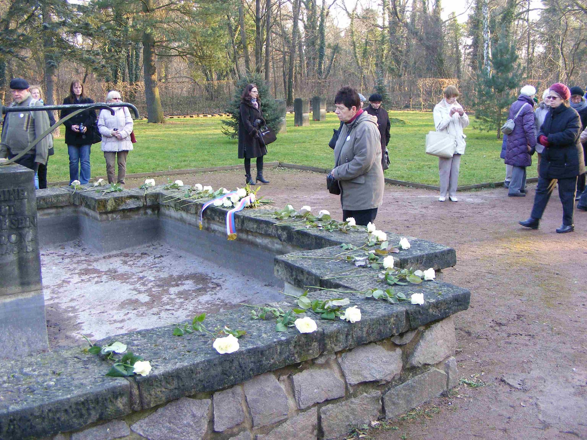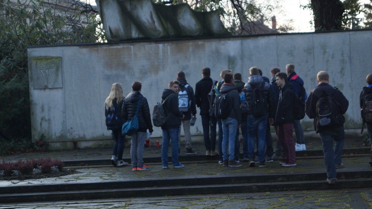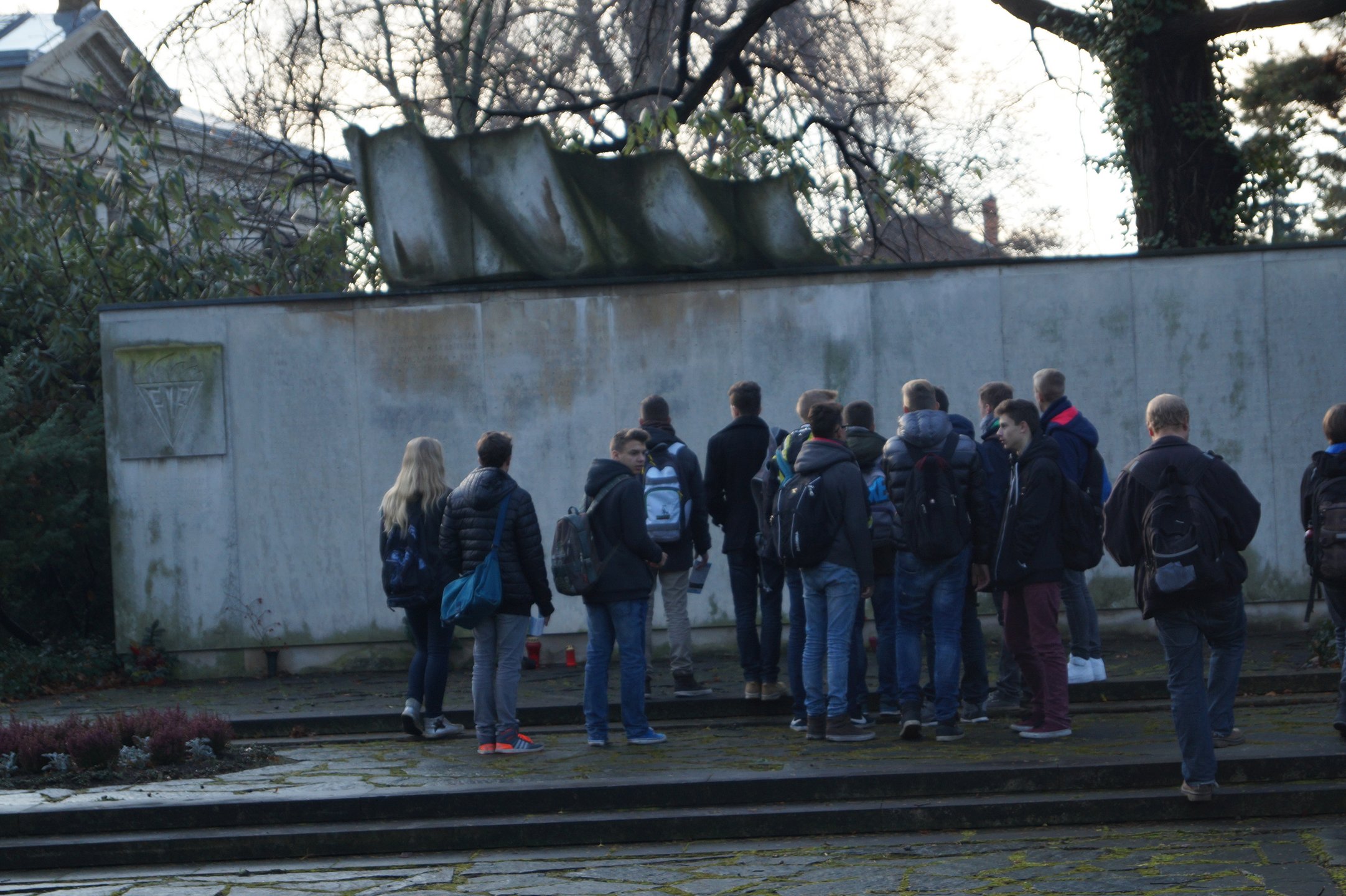 Alle waren sich einig, dankbar und glücklich zu sein, dass sie heute in so einer gerechten Welt leben. Später ging nur unsere Gruppe zum Johannisfriedhof und sah sich die Gedenkmauer für die Widerstandskämpfer an, die auf dem Friedhof bestattet wurden.