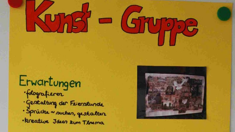 Sie klebten die Bilder, die ausgestellt werden sollten, auf schwarzes Papier, damit sie einen besseren Kontrast hatten. Den restlichen Bildern verpassten sie den letzten Feinschliff. Zwei Schüler der Kunst-Gruppe trennten sich von den anderen, um auf den Johannisfriedhof zu fahren. Sie sollten sich die Feierhalle noch mal genau anschauen und diese auch skizzieren, damit sie eine Vorstellung von der Größe und dem Platz, der verfügbar ist, hatten. Die Powerpointpräsentation wurde fertig gestellt und für die Gedenkfeier getestet.