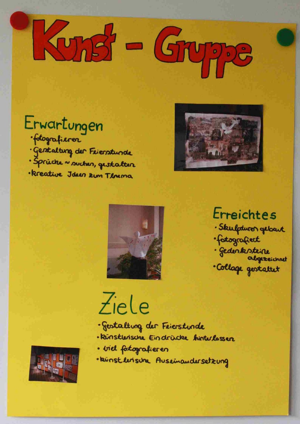 Alle entstandenen künstlerischen Arbeiten wurden auf Stelltafeln in der Schule zur Probe ausgestellt. Zum Abschluss des Tages wurde noch ein Text zum Zweck und den Gedanken zur Gedenkfeier am Laptop geschrieben.