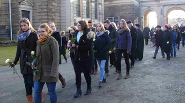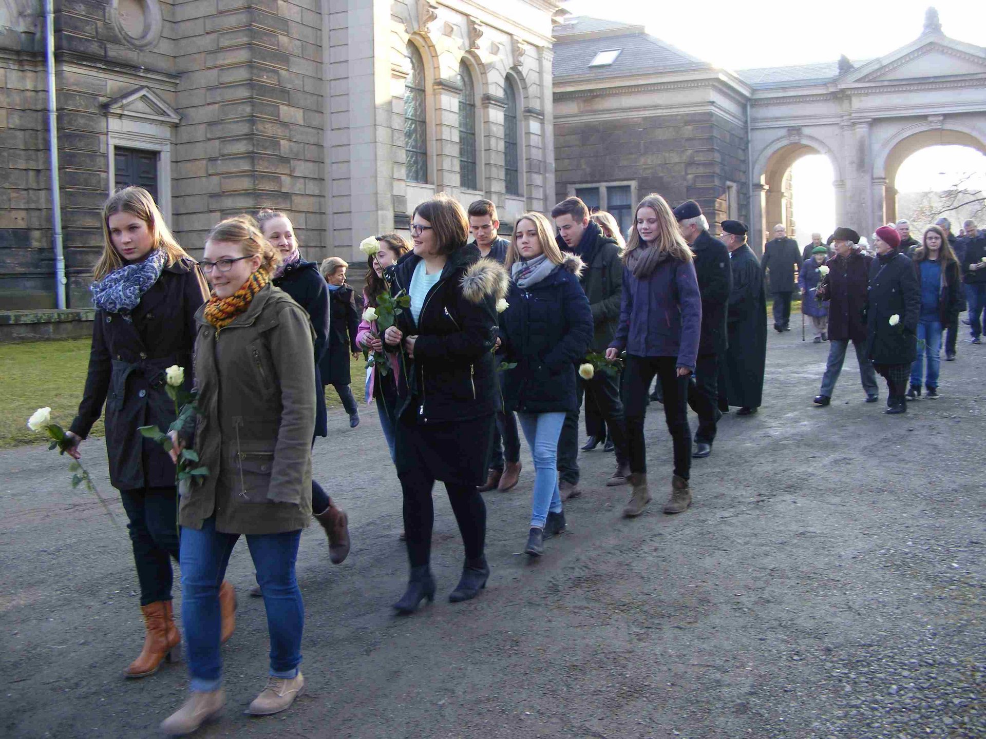 Nach der Staffelstabübergabe am 17.07.2014 an die zukünftigen neunten Klassen sind diese am 12.02.2015 zu Besuch auf dem Johannesfriedhof gewesen, um sich die Gedenkfeier anzusehen.