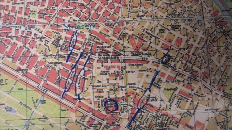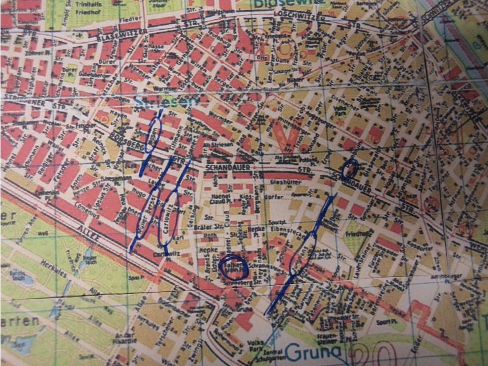 Am Montag haben wir uns ein Grundwissen über den 13. Februar 1945 angeeignet. Danach haben wir uns Gedanken gemacht, warum man heutzutage an solche Ereignisse gedenken soll. Dann fertigten wir einen Stadtplan von damals an. In diesem Stadtplan sieht man die Gebiete, die am 13. Februar zerstört wurden. Viele der Opfer wurden auf dem Johannisfriedhof beerdigt. Wir wollten darstellen, wo einige von ihnen gelebt hatten, um die Orte am Dienstag aufzusuchen und zu schauen, wie diese Orte heute aussehen. - Tag 2: Dienstag, 16.12.2014
