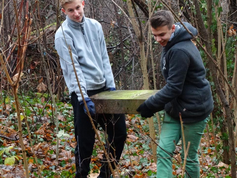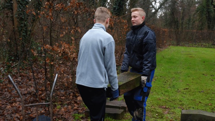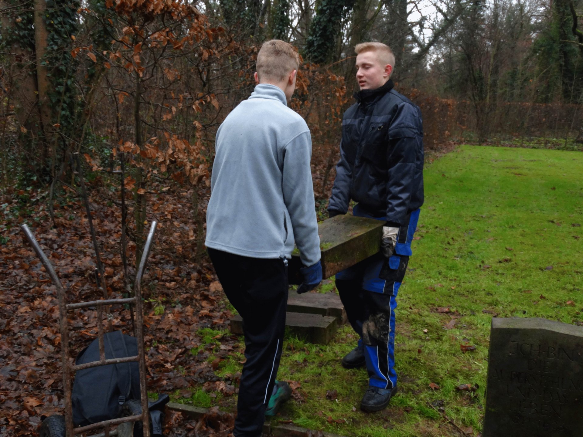 Wir hatten die Aufgabe, die Grabsteine aus dem Waldstück hinter der Kriegsgräberstätte zu bergen und sie aufzureihen. Am ersten Tag des Projektes trafen wir uns um 9:00 Uhr auf dem Johannesfriedhof. Unsere Arbeitsgruppe bekam eine kurze Belehrung und dann ging es schon los. Wir sahen uns das Gebiet im Wald an und fingen an, uns Gedanken zu machen, wie wir vorgehen sollten. Der erste Gedanke war, die Grabsteine einfach locker vorzutragen.
