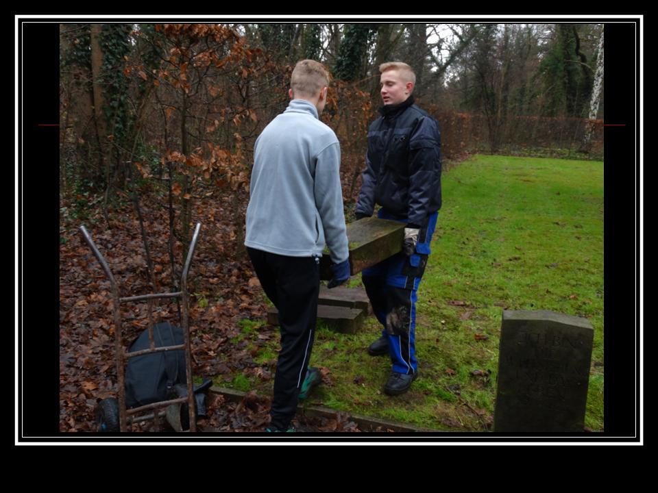 Nach dem ersten Anheben bekamen wir mit, dass die Steine mit ihrem Fundament noch viel zu schwer waren, um sie per Hand wegzutragen. Wir begannen, die Fundamente mit einer Spitzhacke abzuschlagen und so waren sie gleich um einiges leichter. Als weitere Arbeitshilfsmittel hatten wir Schubkarren und Sackkarren, dazu noch Hammer und Meisel. Am ersten Arbeitstag schafften wir es, von den ca. 130 Grabsteinen rund die Hälfe auf die Wiese zu tragen. Am zweiten Tag haben wir rund 50 Steine vortragen können. Den dritten und letzten Tag nutzten wir, um die restlichen Steine zu bergen, zu säubern und die Namen der Verstorbenen zu notieren und zu registrieren. Außerdem sprachen wir über die Anordnug der Grabsteine in einer neu zu gestaltenden Gedenkstätte und kamen zu einem relativ sicheren und simplen Endergebnis.