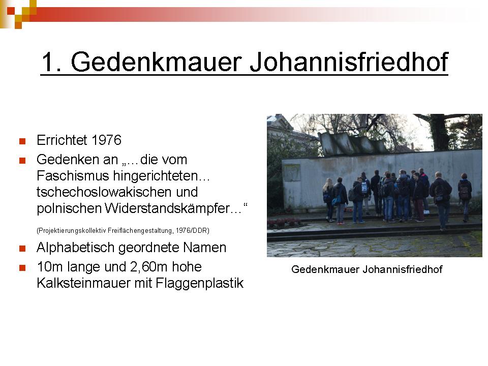 - Die Aufarbeitung der NS-Justiz am Beispiel der auf dem Johannisfriedhof beigesetzten Widerstandskämpfer und der Gedenkstätte für Opfer der NS-Justiz am Münchner Platz.