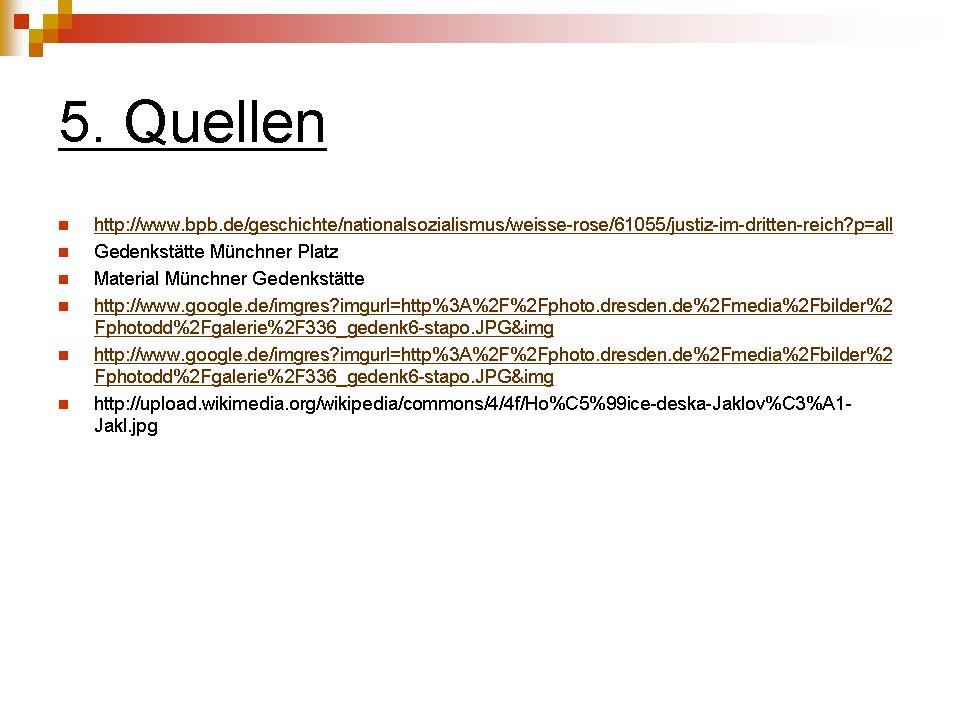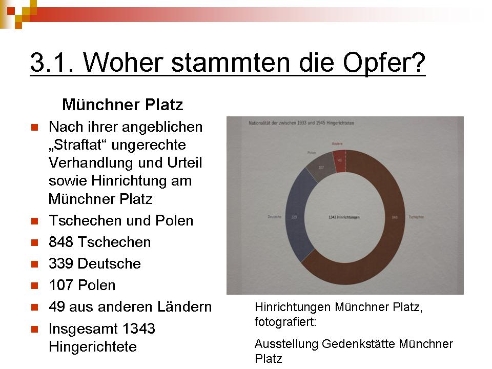 Heute hatten wir die große Aufgabe die PowerPoint-Präsentation zu überarbeiten. Bei dieser Arbeit haben sich Tom W. und Marc mehr mit der Gedenkmauer näher auseinandergesetzt. Ehm und Mariella beschäftigten sich mit der Herkunft, der am Münchner Platz hingerichteten Opfer und wo sie begraben wurden. Tom R. und Kim arbeiteten an der Präsentation weiter und verglichen den Rechtsstaat im dritten Reich mit dem der BRD. - Montag der 6.07.2015: